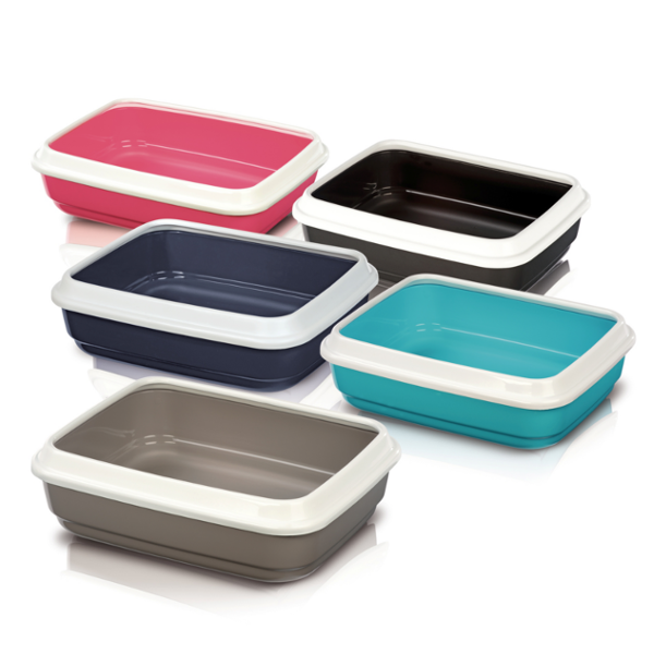 Levehető peremmel ellátott alomdoboz, amely megakadályozza az alom kiömlését.